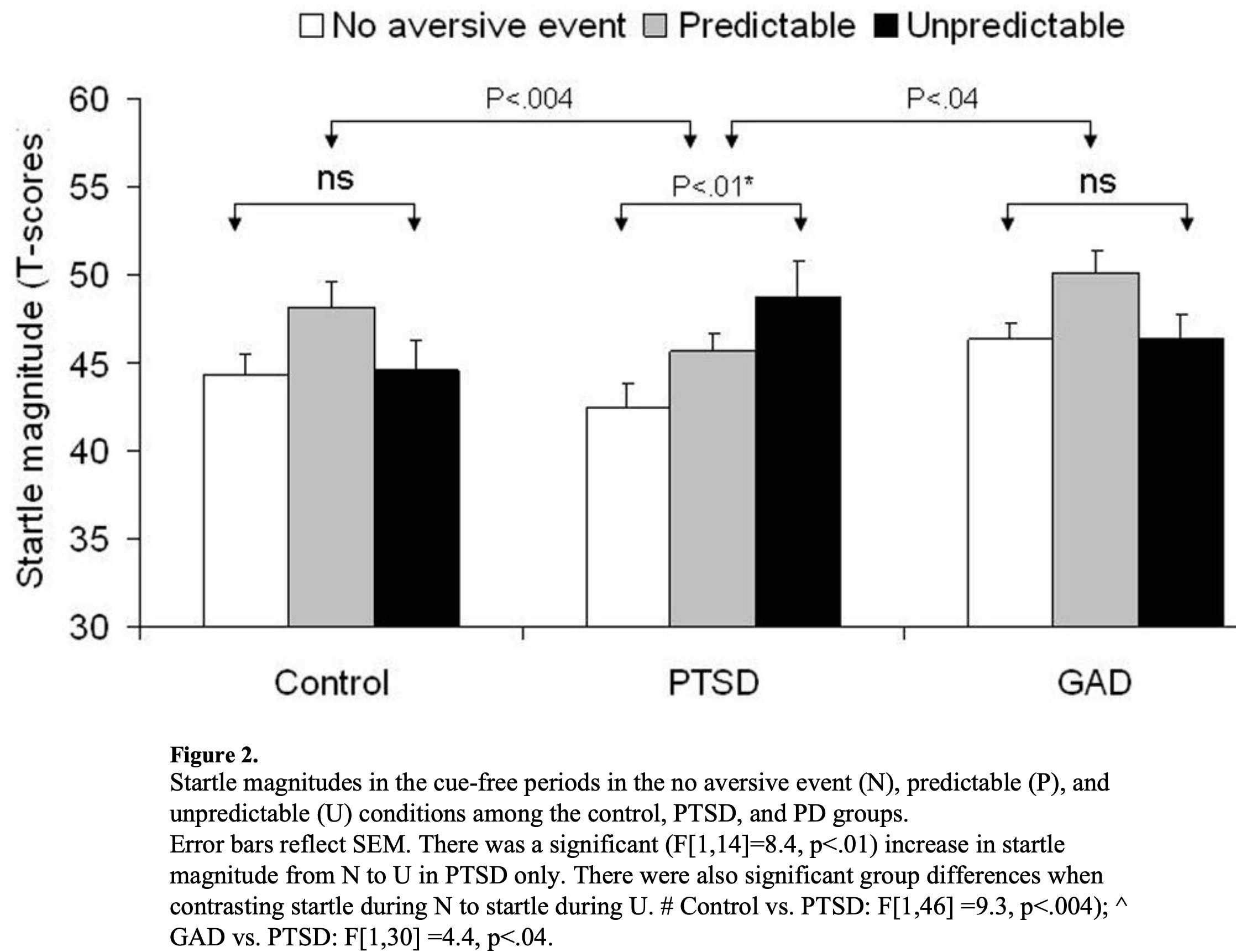 一项研究表明,在不可预测的负性刺激条件下,PTSD 患者的焦虑反应(用惊跳反应衡量)显著高于广泛性焦虑 GAD 患者和健康对照组。而且这种对不可预测的负性刺激条件下高焦虑反应常见于PTSD 和Panic disorder(PD惊恐障碍患者),对不可预测的敏感是两者具有共同的易感性基础