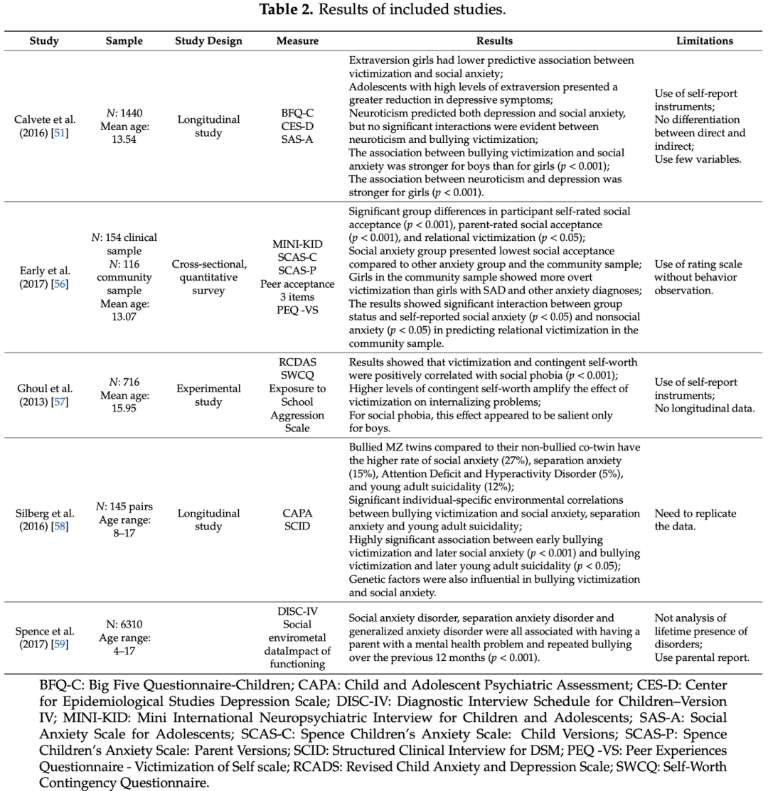 一项综述研究回顾了2011至2018年间关于同伴欺凌与儿童青少年社交焦虑障碍关系的研究,纳入的17项研究一致表明,同伴欺凌经历与社交焦虑的发生呈正相关,且欺凌行为本身可能促使社交焦虑症状的维持与加重;