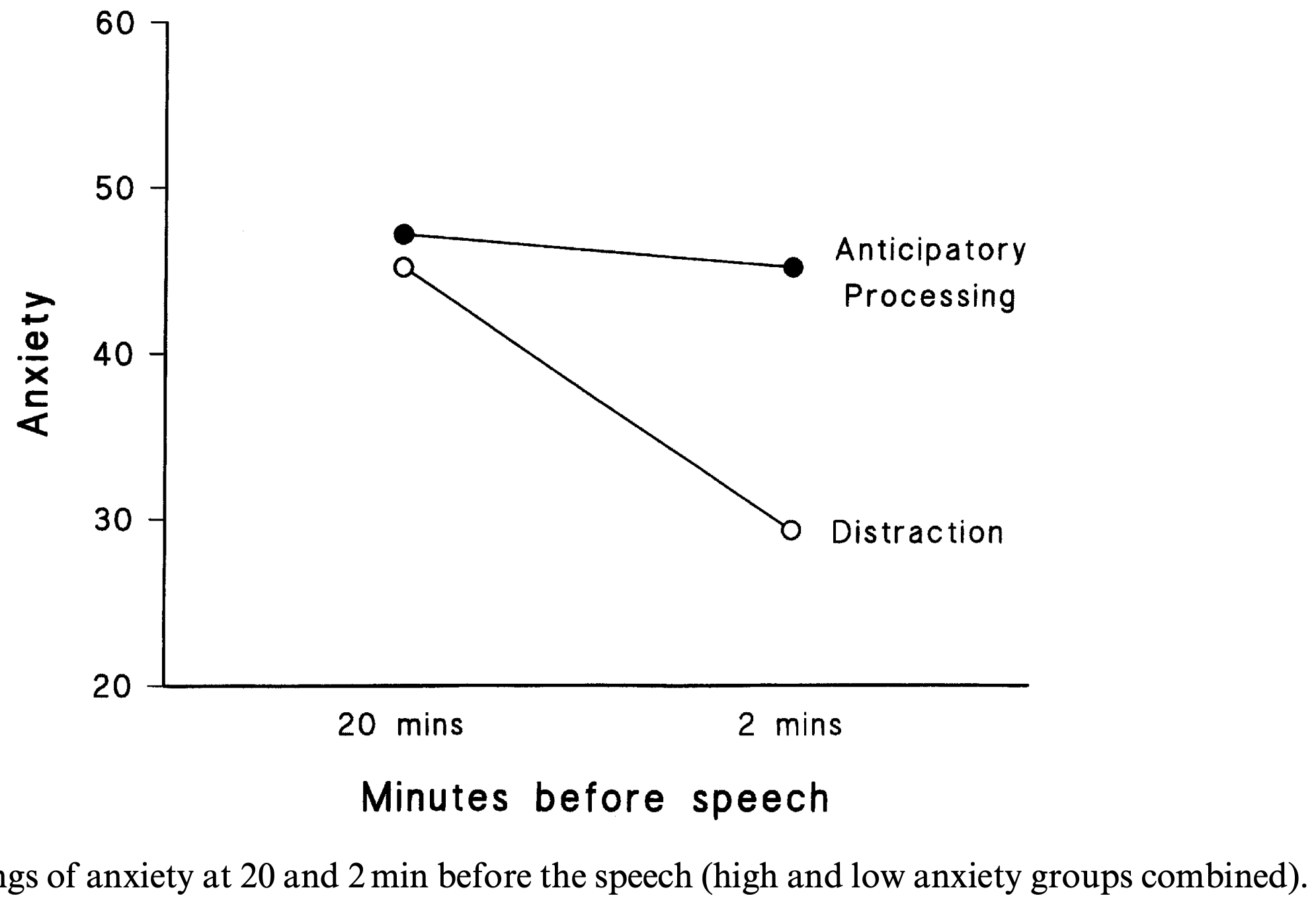一项研究表明(见下图),相较于演讲之前的注意力转移策略,采取预期性焦虑的思维加工模式会让个体在社交活动前(演讲)一直维持在高水平的焦虑体验( 对即将到来的事件的反复消极思考让个体难以放松)