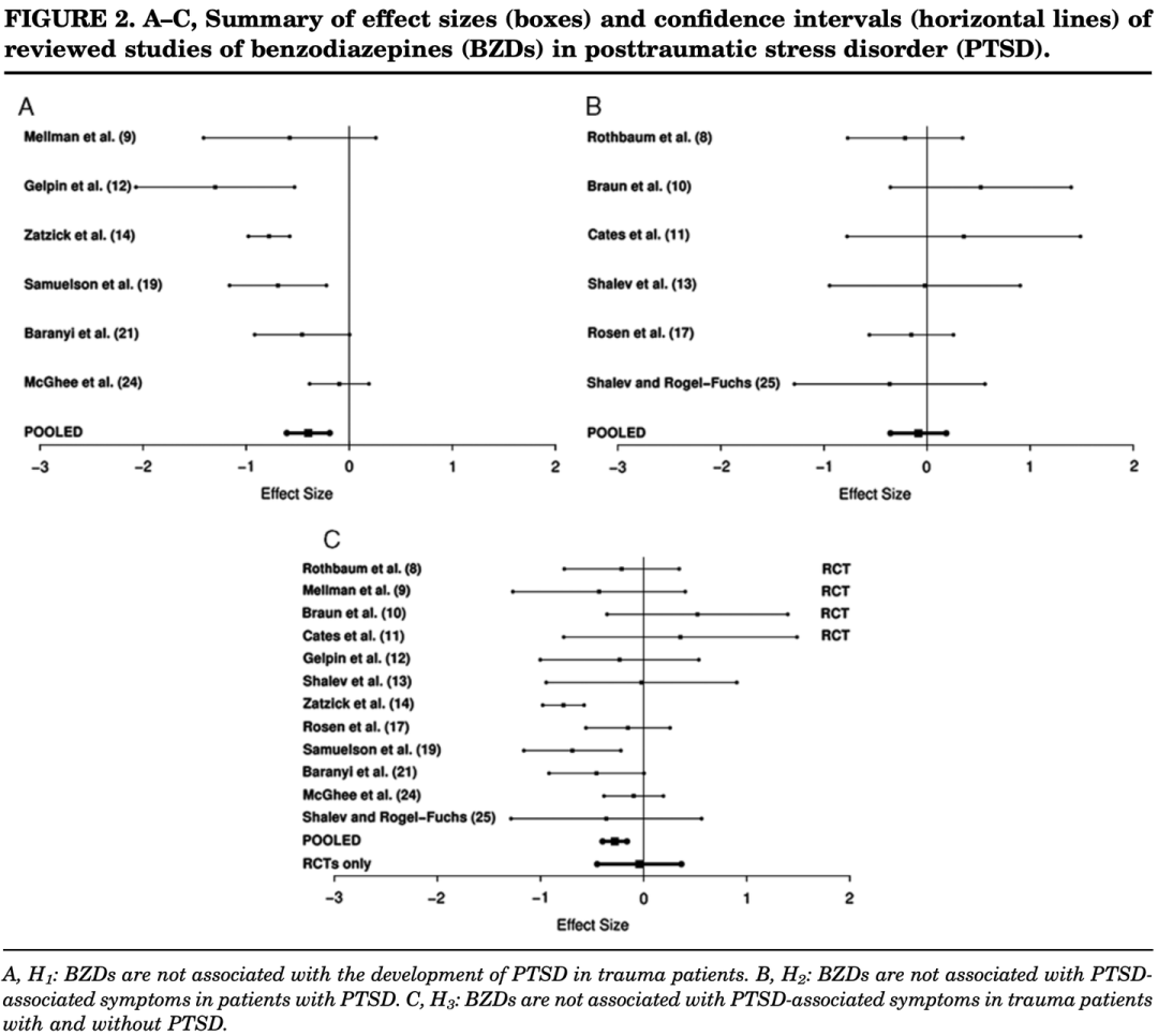 对于 PTSD 患者,在经历创伤后使用苯二氮卓类药物存在争议。一项荟萃分析发现,苯二氮卓类药物不仅对 PTSD 治疗无效,还可能加重整体症状、增加创伤后经历发展出PTSD的可能性,并降低PTSD心理治疗的反应率。