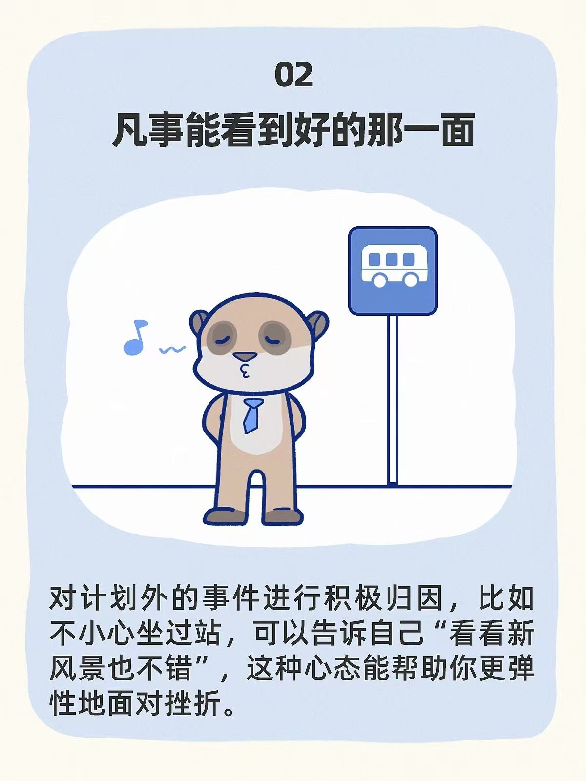 对计划外的事件进行积极归因,比如不小心坐过站,可以告诉自己“看看新风景也不错”,这种心态能帮助你更弹性地面对挫折。