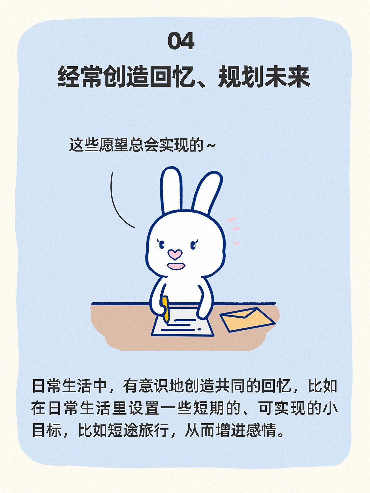 日常生活中,有意识地创造共同的回忆,比如在日常生活里设置一些短期的、可实现的小目标,比如短途旅行,从而增进感情。