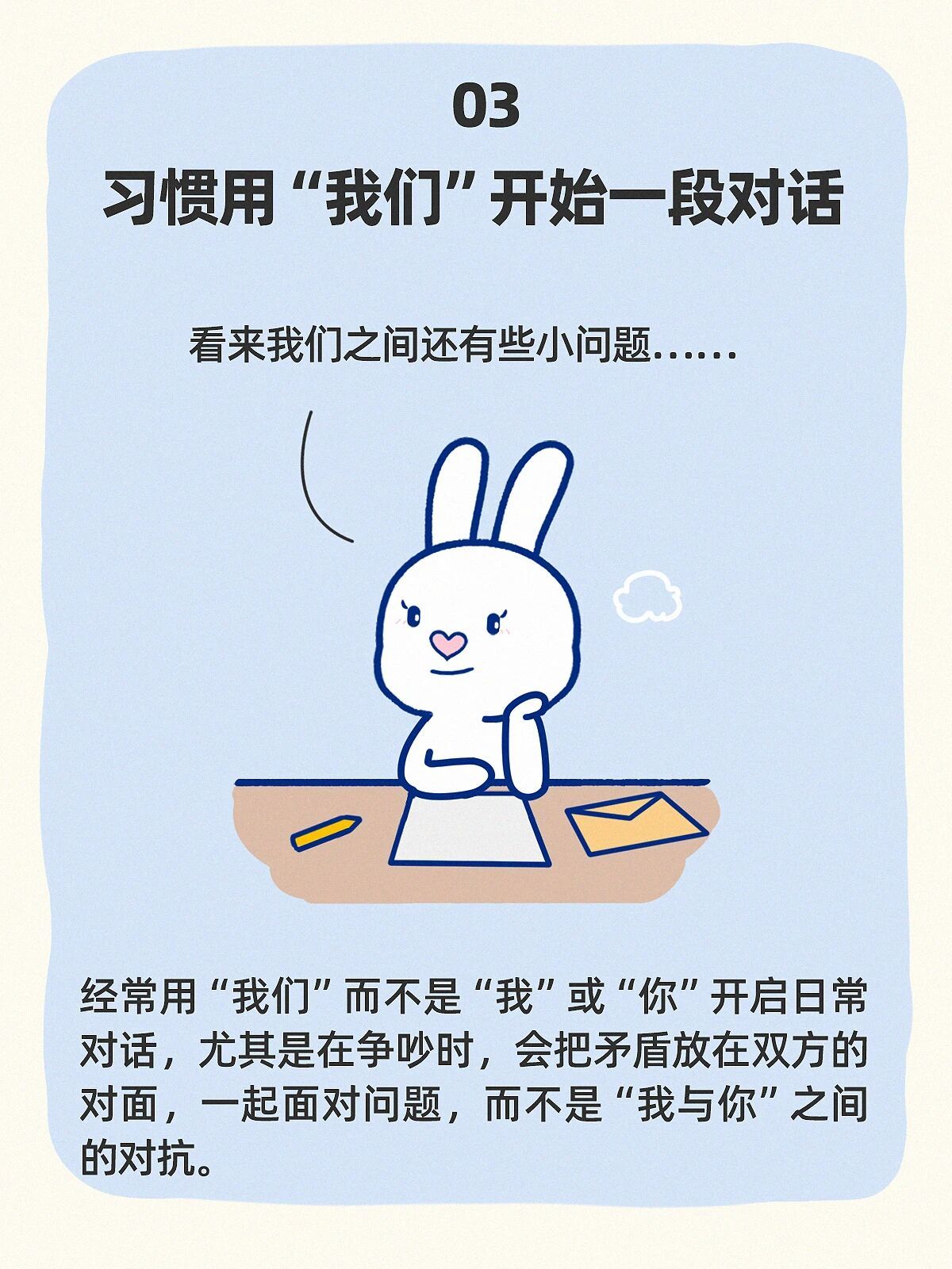 经常用“我们”而不是“我”或“你”开启日常对话,尤其是在争吵时,会把矛盾放在双方的对面,一起面对问题,而不是“我与你”之间的对抗。