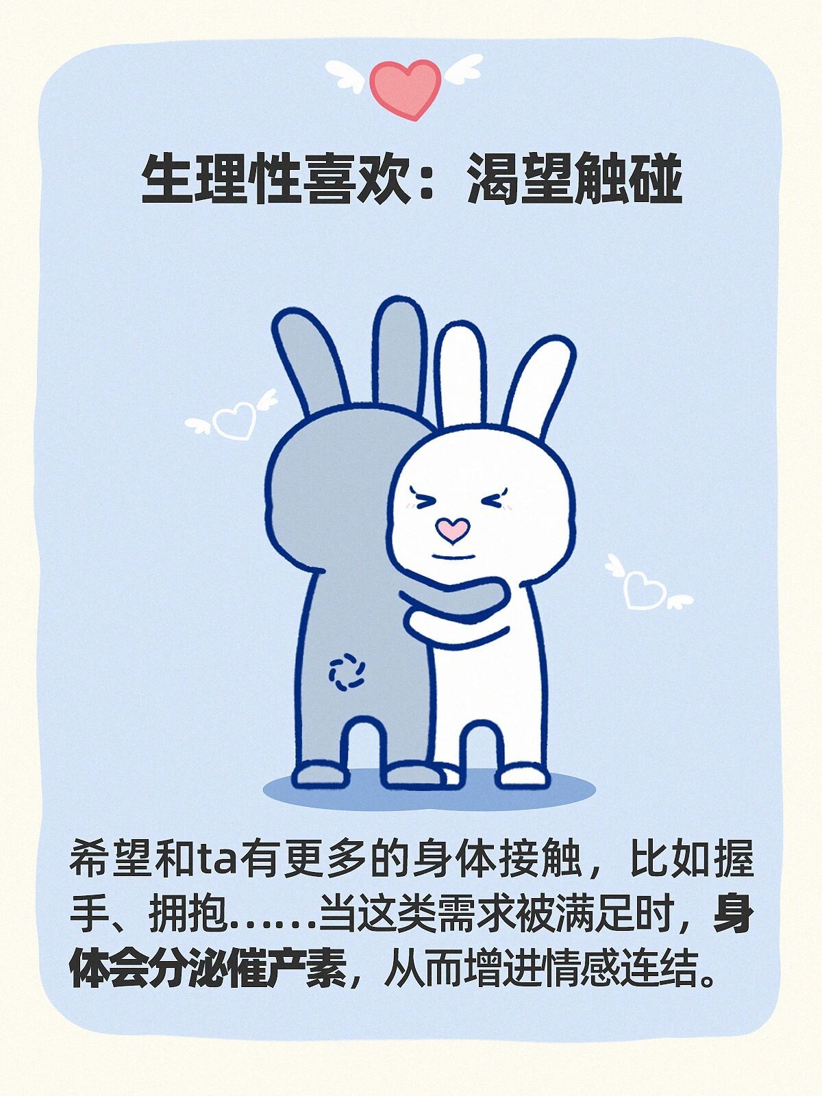 希望和ta有更多的身体接触,比如握手、拥抱..…...当这类需求被满足时,身体会分泌催产素,从而增进情感连结。
