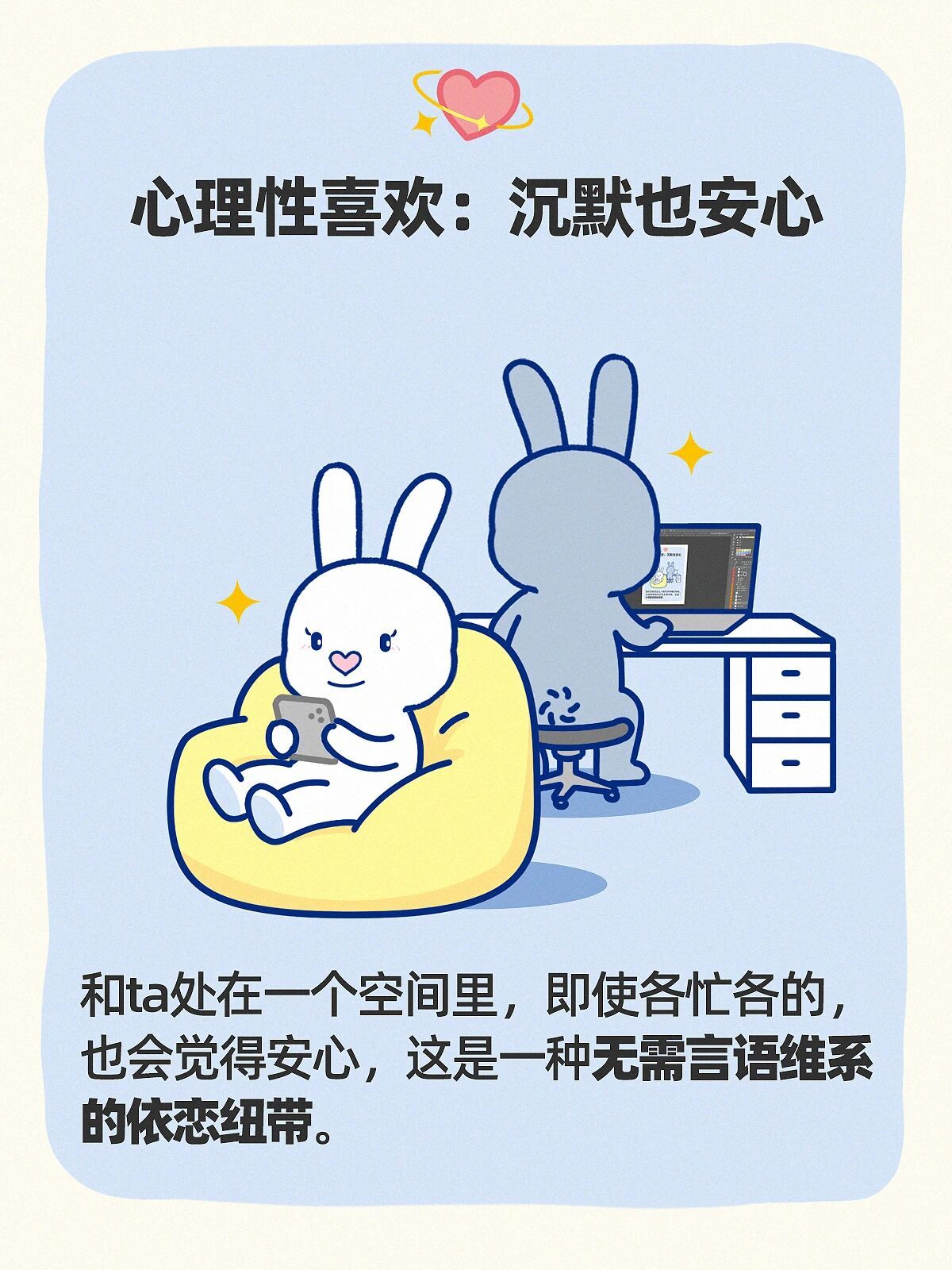 和ta处在一个空间里,即使各忙各的,也会觉得安心,这是一种无需言语维系的依恋纽带。