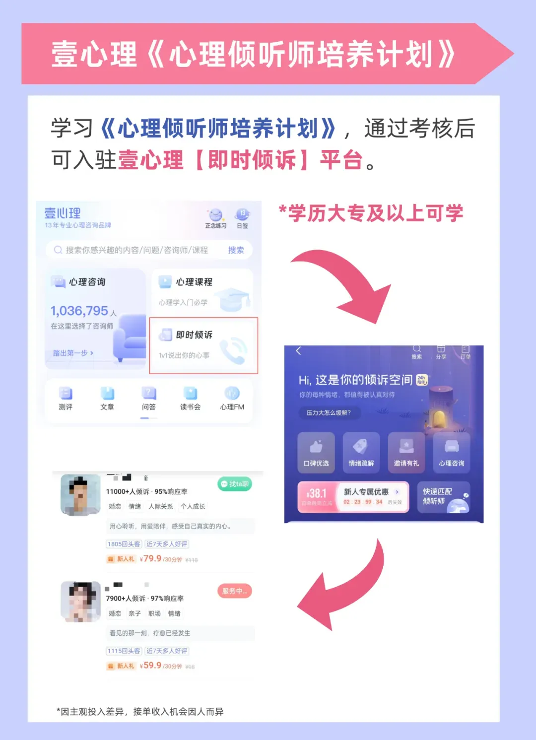 只要你是大专及以上学历,你就有机会成为壹心理的心理倾听师