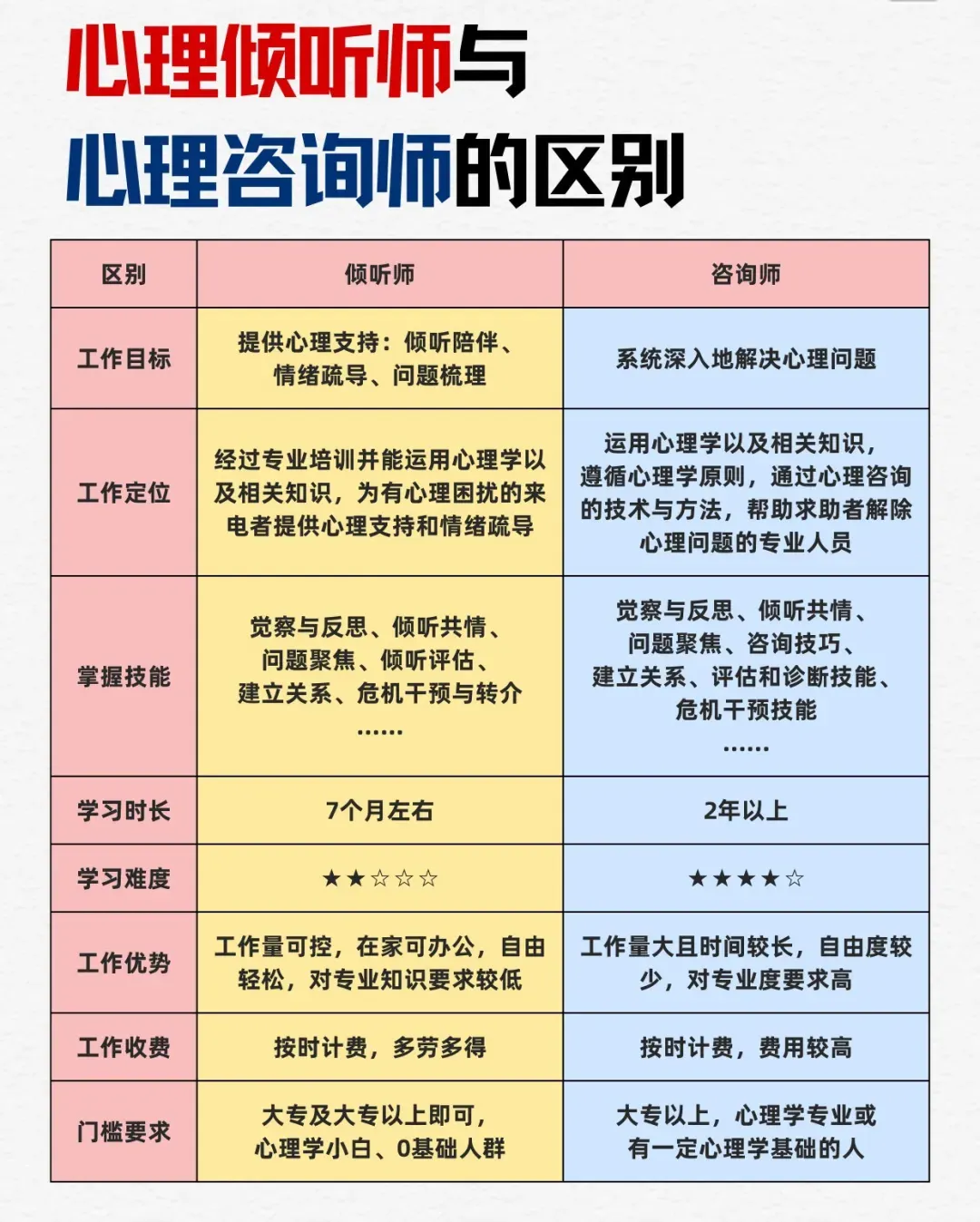 在学习内容方面,心理咨询师需学习更多的内容,且因为咨询师的学习难度较大,费用也很高;