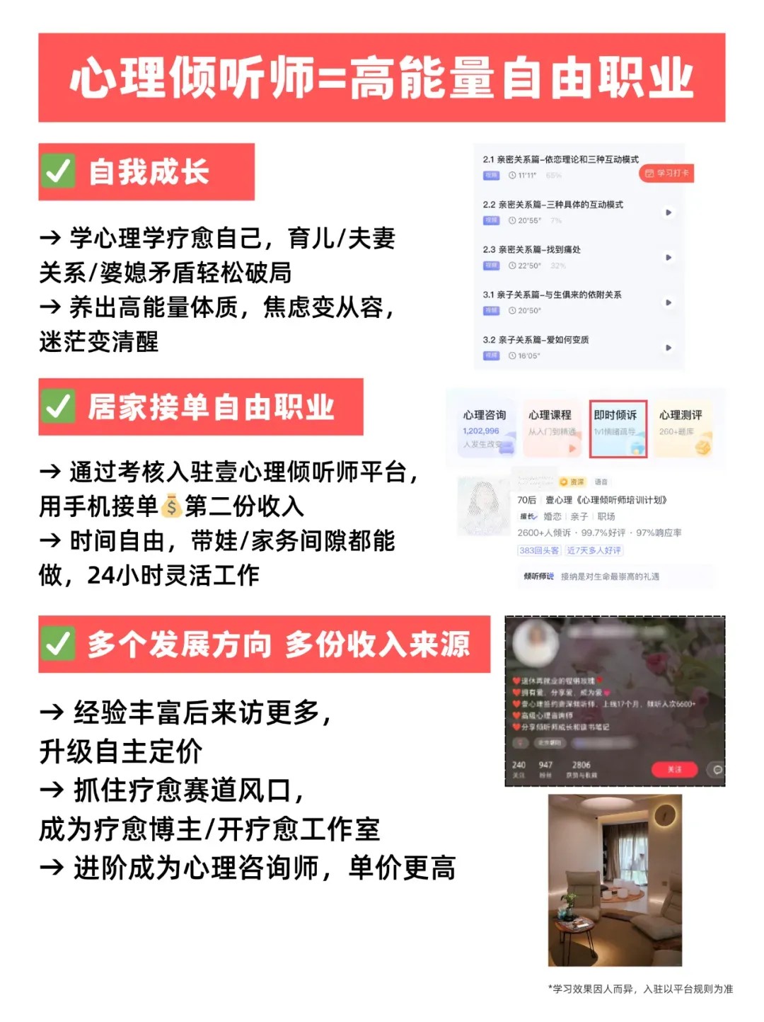 学习后通过考核,除了成为壹心理【即时倾诉】平台的专业心理倾听师,还有机会0元参与壹心理平台小红书ip打造培训,从零到一运营自己的账号,打造爆款笔记,成为有影响力的个人ip。