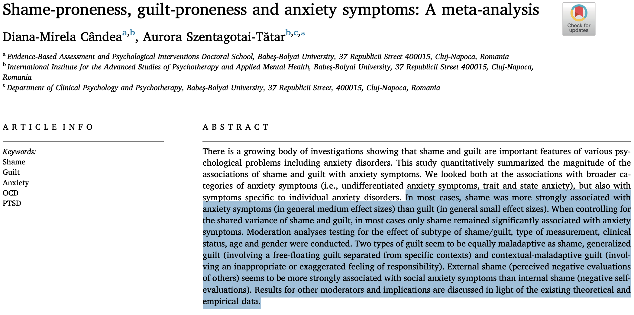 一项元分析研究还发现,羞耻与焦虑症状的相关性明显高于内疚。在排除羞耻与内疚的共同变异后,仅羞耻仍能显著预测焦虑症状,其中外在羞耻(感知他人负面评价)与社交焦虑的关联强度超过内在羞耻(负性自我评价)「20」。