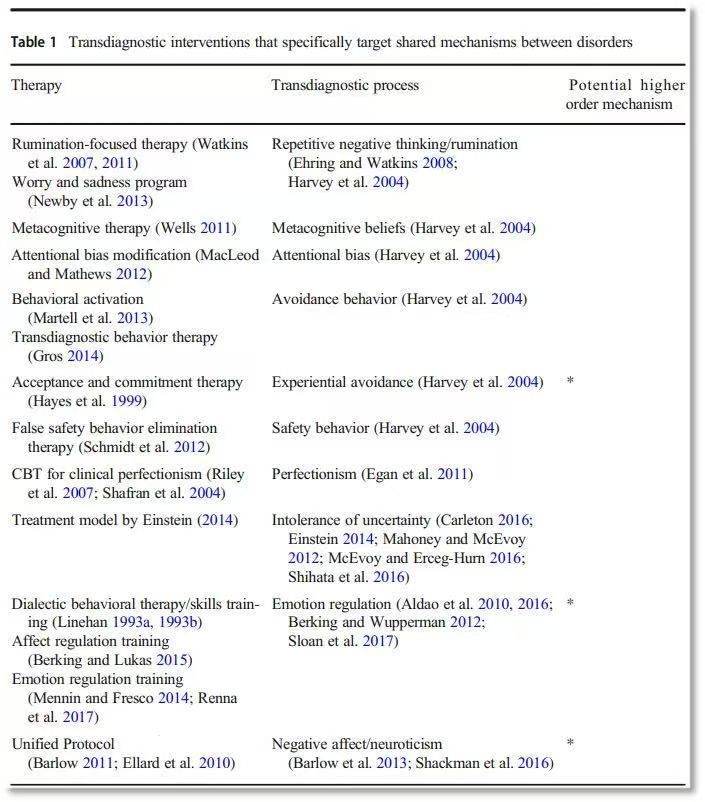 当前,大多数关于跨诊断共享机制(shared mechanism between disorders)的研究主要聚焦于基于病因学的认知行为取向,涉及的关键机制包括选择性注意、思维反刍、元认知信念及经验性回避等等(见下图)「2」。(详情:跨诊断的心理治疗Transdiagnostic ▏基于病因的循证干预)