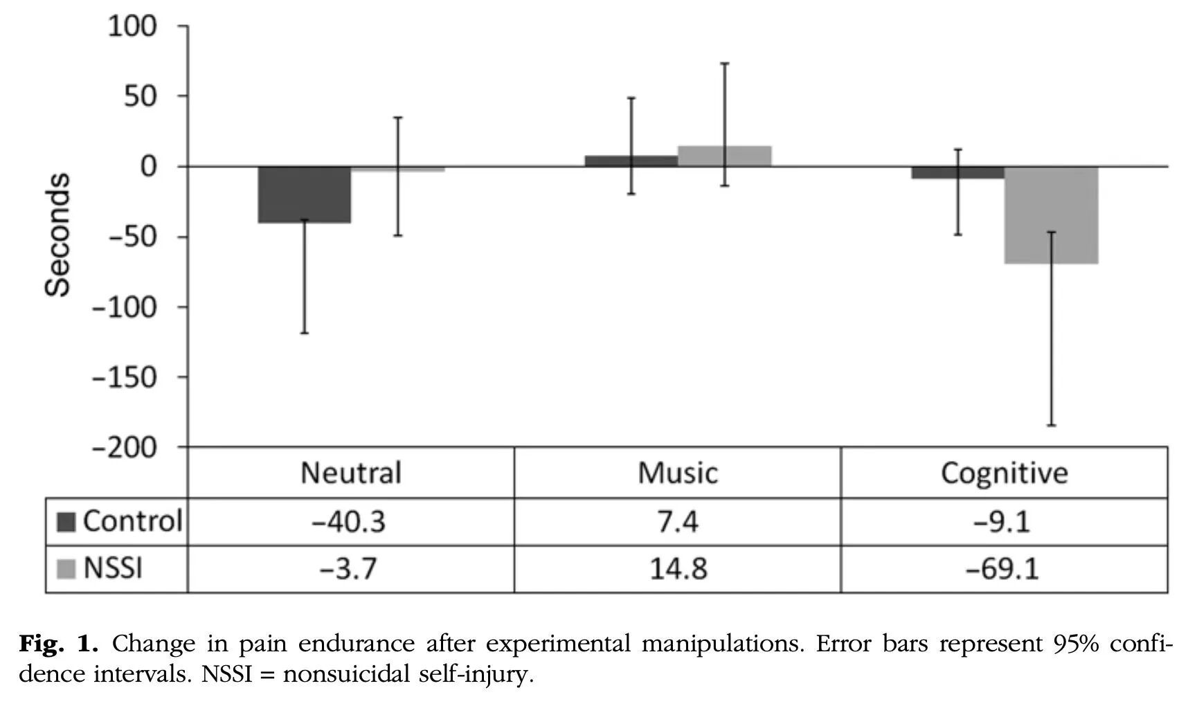研究者随机将NSSI个体和对照组分配至三种条件(积极音乐、中性刺激和旨在增强自我价值感的简短认知干预),并测量干预前后的疼痛耐受时间。