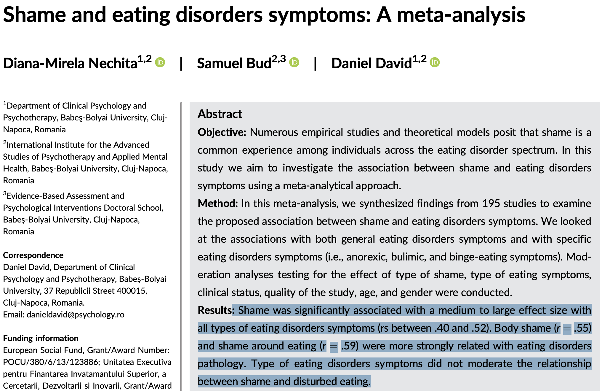 Nechita, D. M., Bud, S., & David, D. (2021). Shame and eating disorders symptoms: A meta‐analysis. International Journal of Eating Disorders, *54*(11), 1899–1945.