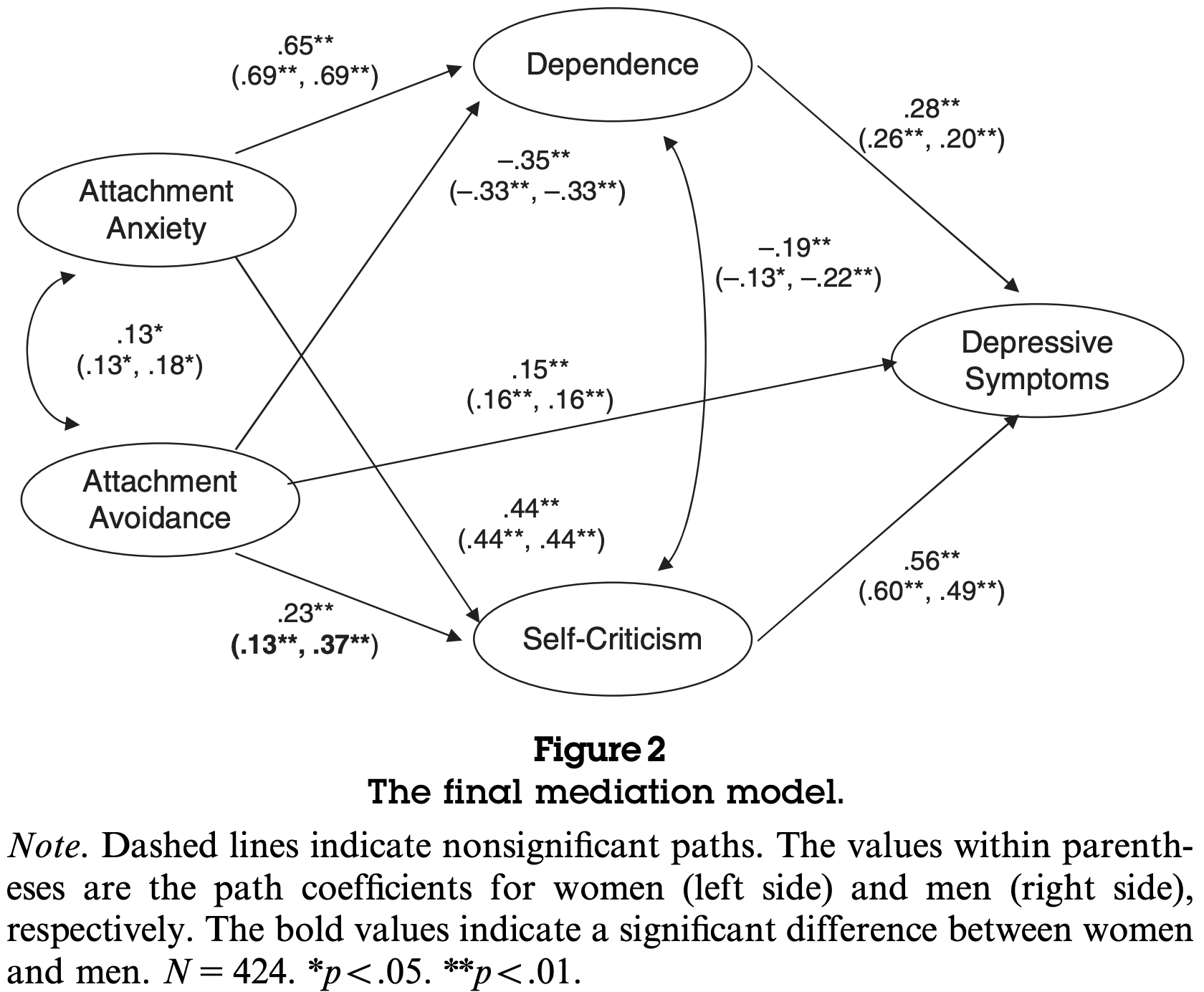 Cantazaro, A., & Wei, M. (2010). Adult attachment, dependence, self-criticism, and depressive symptoms: a test of a mediational model. Journal of Personality, *78*(4), 1135–1162. https://doi.org/10.1111/j.1467-6494.2010.00645.x