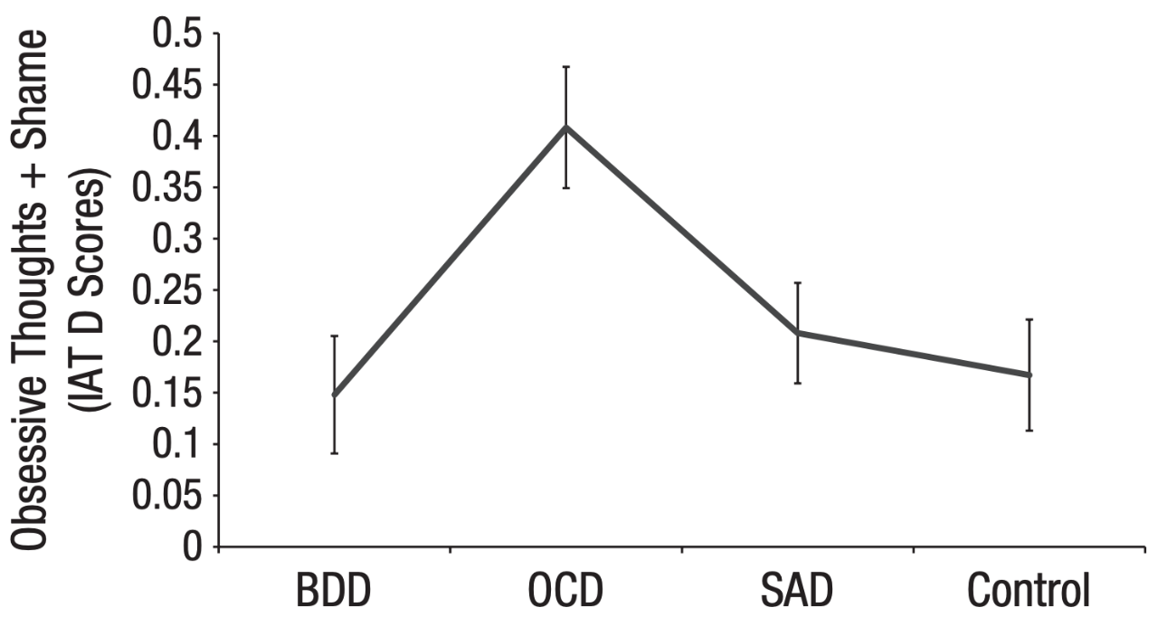 上图展示了四组被试在“强迫性思维 + 羞耻”隐含联结任务(IAT)中的得分,结果显示OCD组的得分最高,远高于社交焦虑障碍(SAD)、躯体变形障碍(BDD)及健康对照组,说明强迫症患者更倾向于在内隐层面将强迫性思维与羞耻联系起来。