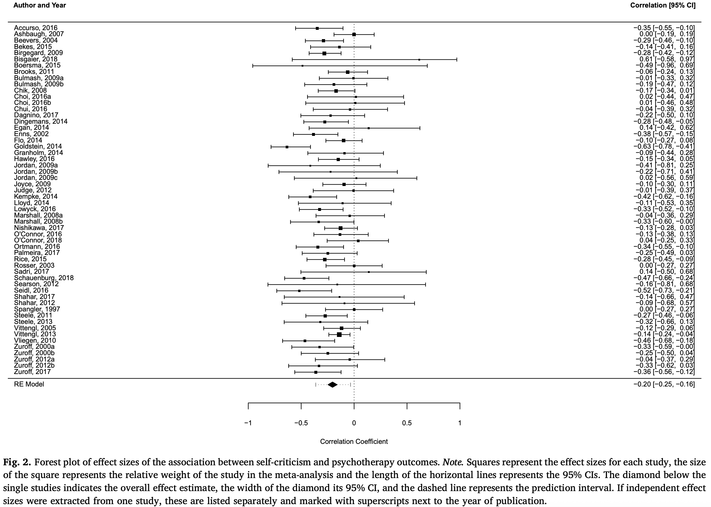 此外,自我批评也被证实会影响心理治疗的效果。一项元分析显示,治疗前患者较高的自我批评水平与较差的心理治疗结果显著相关(见下图)「4」。