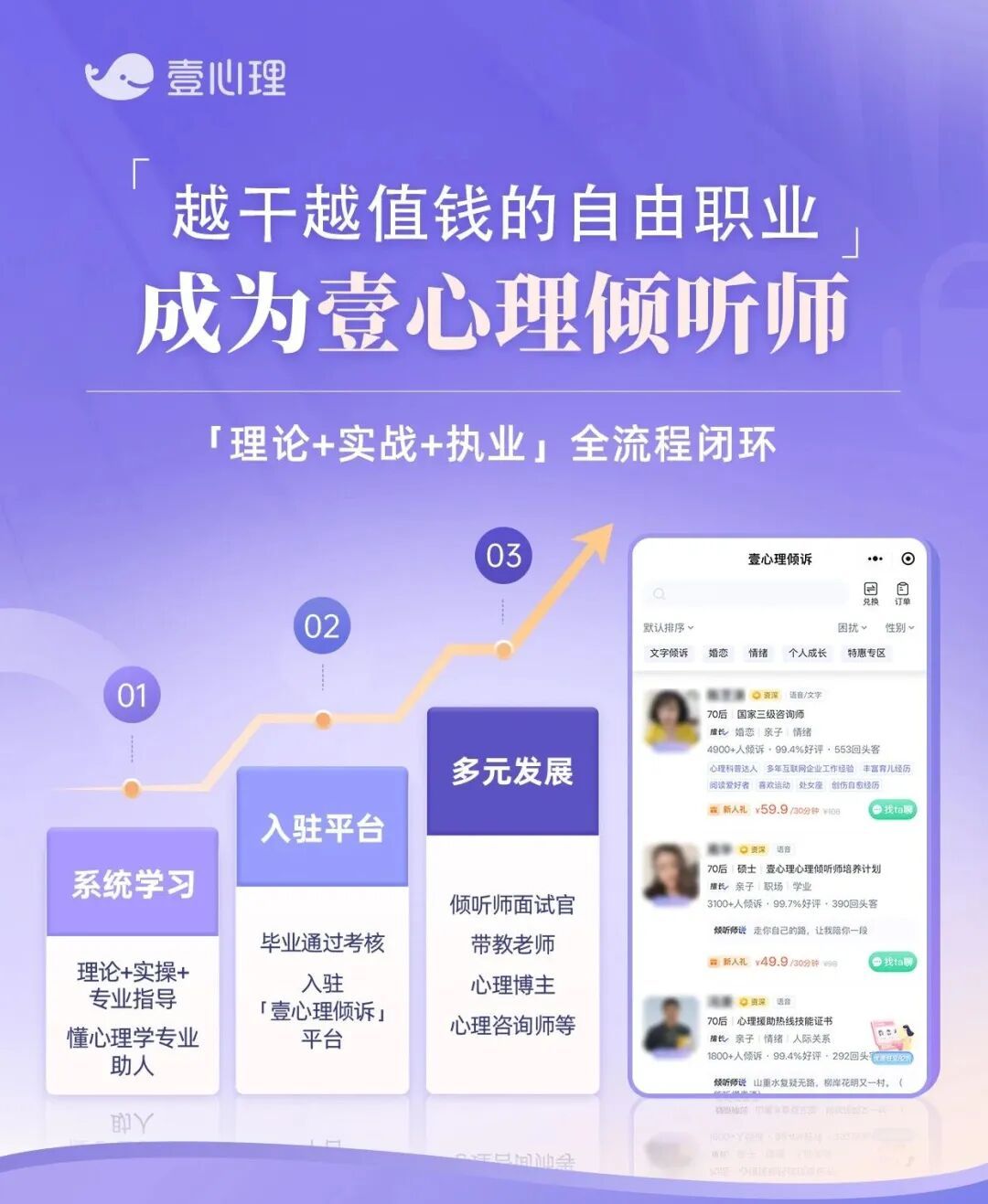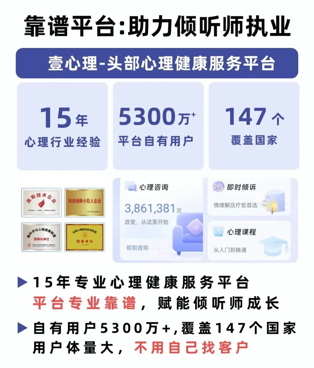 作为深耕心理行业15年的专业平台,壹心理依托累计服务5300万用户、培育数万名心理从业者的深厚积淀,打造了“理论+实战+执业”一体化的倾听师培养体系,凭借三大核心亮点,助力学员从0到1成长为有温度、有专业度的倾听师,破解行业人才培养的痛点与难点。