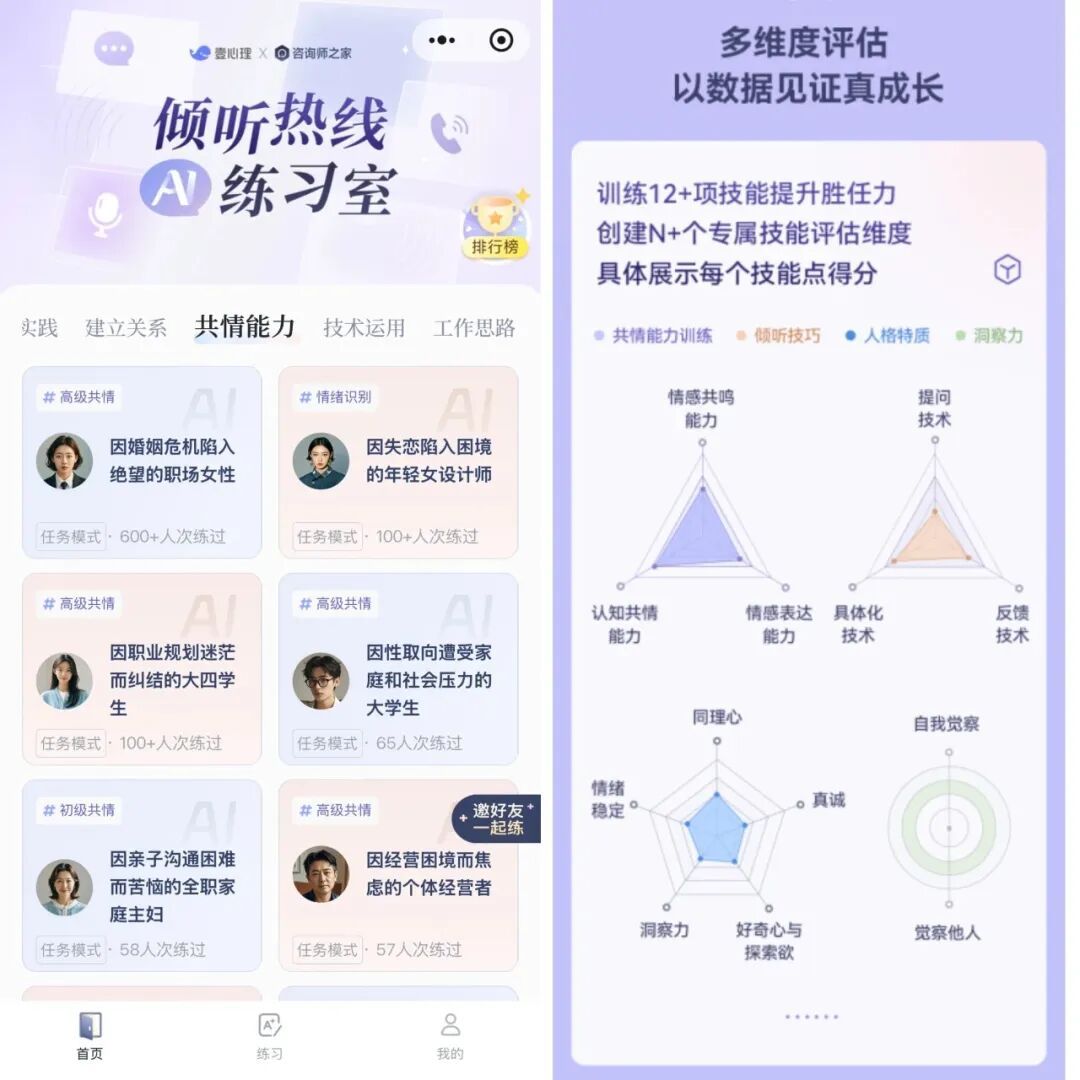是壹心理的一大亮点。AI会实时分析学员的实操练习数据,精准定位倾听、共情等技能的短板,提供针对性反馈,让学习不再盲目。配合“一阶自我赋能+二阶执业实操”的系统化课程,从关系建立到行为改变,从危机处理到场景模拟,每个模块都紧扣胜任力模型,确保学员“学得会、用得上”。