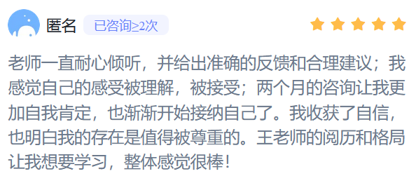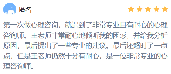 王老师以精神动力学取向为主,擅长原生家庭、亲密关系、抑郁焦虑、情绪管理等议题,如果你在自我认同、内心冲突、个人成长等方面有困扰,相信他能够很好地共情、帮助到你。