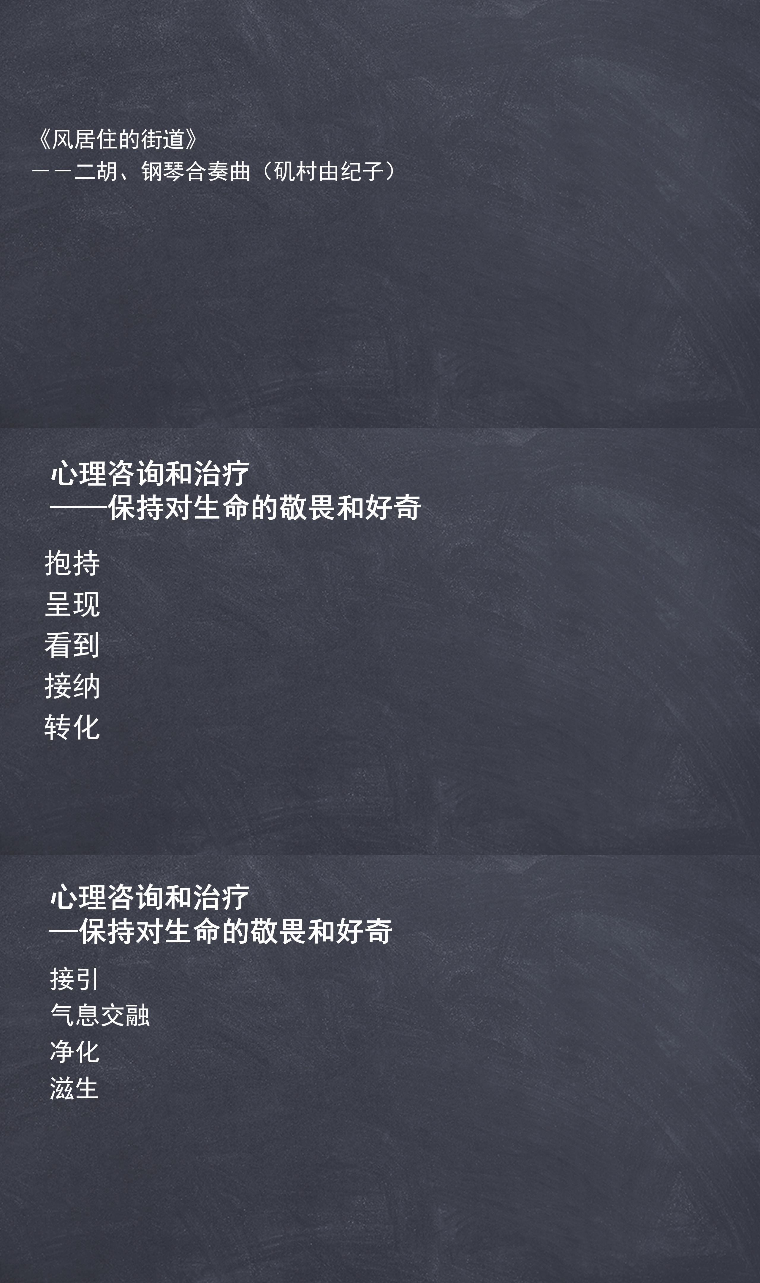 好,接下来的话我想跟大家一起听一首我很喜欢的歌曲,叫《风居住的街道》,然后我在这里放,然后大家可以用你喜欢的舒服的方式来听。大家可以去回味一下,然后去感觉一下你听到了什么,就在这个曲子里听到了什么。如果我们把这个曲子跟我们的咨访关系咨询过程联系在一起,又会是一个什么样的过程呢。在一开始的时候,是钢琴的声音先出来的,然后钢琴的话好像在咨询的当中去铺设舞台,它的声音是很平稳的,然后比较悠扬的、比较平稳的,然后就像是铺设一个安全的咨询空间,接着有二胡的声音出来了,其实是一开始二胡的声音出来的话,其实是有一些低沉,有一些凄凉的,但是在二胡的声音出来的时候,其实钢琴是一个比较稳定的有力量的,但是是作为背景音一直在陪伴着它。后来是以钢琴为主的时候,其实某种程度在重复,它的曲调是在重复二胡的声音,但是它是以一种它没有那么的哀婉凄伤凄凉哈,但是是一种比较有力量的,但是曲调都是在重复,几乎都是在重复,但是又带有不一样,某种程度,其实我听到了,然后就是我消化了,然后我以一种比较有力量的方式,或者我理解了我回馈给你。我是能够承接着一些的,后来有二胡的声音再出来,其实那个声音还是会有一些凄凉,但是比前面好那么一点点,然后这时候钢琴继续是以一种稳定有力量的声音 在陪伴着它。后来有一段两个人的那种合奏,还有比较稍微高亢一点的合奏,两个人在一个比较激烈的在进行互动,然后接着又有二胡的声音,然后钢琴依然是在那里进行陪伴的,然后到最后的话,二胡的声音没有前面的那么凄凉,虽然还带着一些哀婉的味道,但是始终有钢琴的那种稳定的力量在背景作为陪伴着它,两个一直在这样前行。我觉得这个很能够展现我们的咨询的过程。在一开始的时候,其实我们说咨询师的话是要去负责去建立,要让来访者感觉到安全稳定,包括这里面的话,其实是,包括很多的关于咨询设置。其实我们没有特别讲咨询设置,我相信这个系列课程当中是有咨询设置的内容的。咨询设置是非常重要的,一部分是关于搭建安全舞台当中非常非常重要的一部分,当然了,除了咨询师去确定跟他来访者商量确立咨询设置,还有就是你这个人,你的接纳、温暖稳定的在那里,那么这也是咨询设置的一部分,也是你让他感觉到真正安心的东西,但是设置也是很重要,设置也是来帮助咨询师的。要有这样的一个稳定的东西的话,他感觉到安全稳定。可能就是因为我们,这个曲子就只有4分多钟,那么前面的这一个小段的话,可能在我们的咨询当中可能是一个蛮长的阶段的,因为对于一个(个体)是有很早期的问题的话,他要去建立很信任的关系是要花蛮长时间的。还有信任的层级对不对,但是不管怎么样,我们会有经验就是可能他没有不一定要到那么深,但是他开始可以去流露。就我们讲,如果你没有办法让他呈现,那又何谈看见是吧,我们都会有这种经验,如果在一个比较危险的环境的时候,我们的潜能都会被激发出来,我们呈现的可能是自己有力量的部分,但是没有来访者是因为自己有力量走进咨询室的。当然了要走进咨询室也是要有一些力量的,但走进咨询室是因为脆弱的部分而来的,或者受苦的部分而来的,但是只有安全的 stage,你可以说舞台或者是空间,他才可以去这么流畅的去呈现这么凄凉哀婉的声音。这是他的心灵的声音,而不是很多时候我们会注意到,很多时候来访者会,他讲的故事是蛮凄惨的,但是会觉得其实他好像在讲别人的故事,其实是他真的能够那么放下了然后觉得已经就是云淡风轻了,不是的。我们讲这是他隔离,或者可能还有更原始的更早的对很多东西否认,因为当然还有更早期的可能,就是他根本就没有记忆,他只有身体的一些表达都有可能的,但是他要能够在咨询当中去呈现出来是需要有这个安全的环境的。当然了还有一种情况是有的来访者他移情发展非常的迅速,所以可能他第一次的时候就让你感觉到整个骨头都在疼,或者是如坠冰窖,这也有可能,但是总体上的话,就算他一开始让你如坠冰窖的话,他对你(的移情)其实是他自己控制不住。因为移情的发展太迅速,就他翻涌的东西太多了,但并不等于说他可以呈现这一些,他就是信任你,可以很好的去进行工作了。因为要真的对这样的来访者,真的建立内在的信任的话,是蛮困难,(需要)蛮长时间的,总体上你能够去,他开始可以去呈现,然后呈现的话,所以我就觉得这个曲子非常棒,我想人家创作的时候不是这样想的,但是他呈现的还要能够被你捕捉看见,是不是。因为我们有太多的时候是其实来访者已经呈现了,但是被咨询师忽略了,所以我们要能够看见,还有很重要的事,其实你看刚才的咨询,刚才这个曲子是他看见了对吧,他都听见看见了,然后他会去反馈给来访者,其实有时候的话我会看我在督导的时候,我会发现,其实很多时候咨询师是有感受到的,他的确是很擅长去陪伴到,但是他不敢去反馈,因为种种原因,他可能说出来的跟他感受到的是非常不一样的东西。其实刚才的钢琴音的话,你看你呈现了什么,我告诉你我看见了,你这些东西我都看见了,但是我是有力量的,那个声音是很有力量的,然后我是能够抱持得住的。那么这样子的话,其实每一个来寻求咨询的来访者的话,他都是渴望被看见的,但是他在渴望被看见的背后的话,他会挡了很多渴望。你有时候给他一些