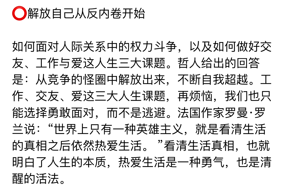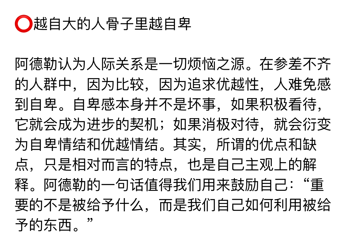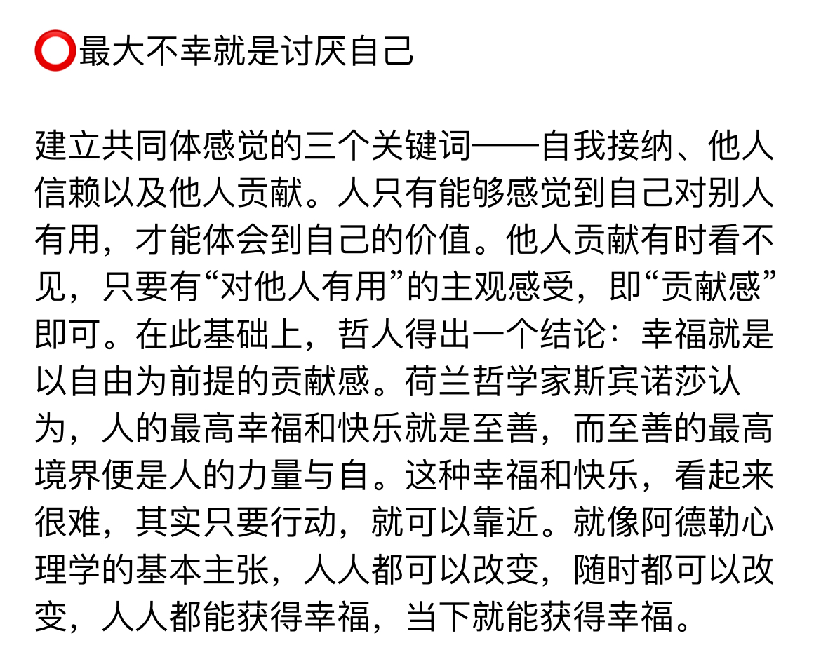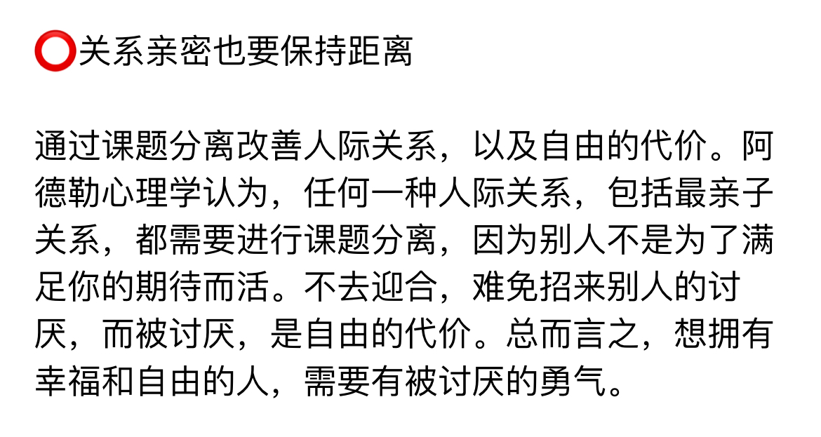 感悟:或许以前就是没有拥有被讨厌的勇气,肆意讨好别人,活在别人世界和言语中,从来没想过好好爱自己,不会答“工作.交友.爱”这三道大题,也做不到课题分离,就如书中一句话“别人如何评价你的选择,那是别人的课题,你根本无法左右”,希望你有这个勇气包括,不怕被黑,不怕试错,被死千回还能重新活过来的力量!加油,有一个好消息经过心理咨询和开药治疗,去医院医生复诊预计恢复了3分之一的状态吧❤️